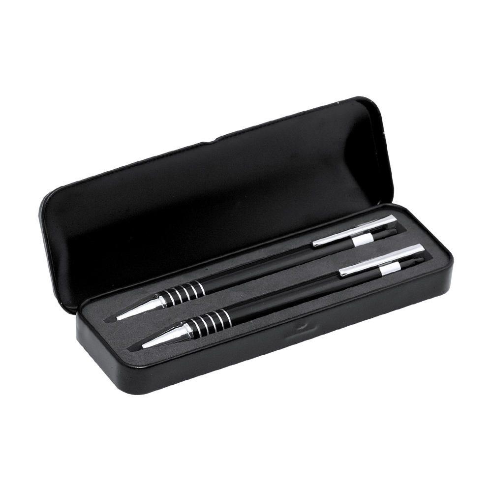 Set of ball pen with push-up mechanism and mechanical pencil in an original bicolor design. Metal body in a smooth finish with bright tones and accessories in silver color. With ringed grip and presented in a resistant individual metal case with soft foam inside. Jumbo cartridge ball pen, with blue ink, and 0.7mm leads included.
