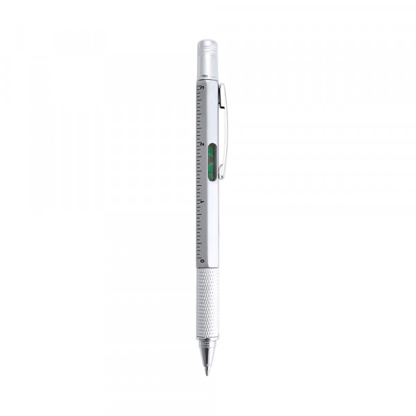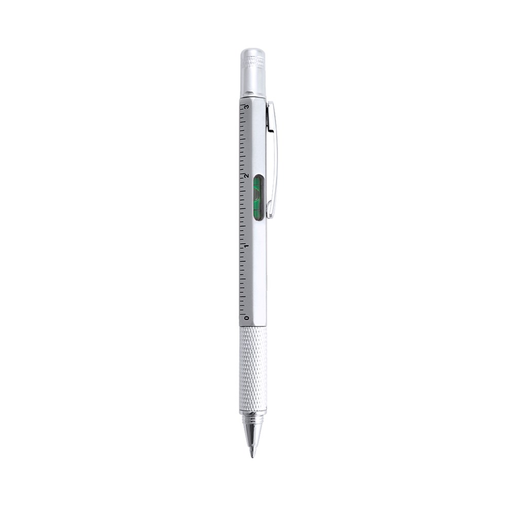 Multi-tool ball pen 4-in-1 with twist mechanism, in varied colors and with soft grip. With built-in level in body, ruler with metric system in centimeters/inches and double-head screwdriver -flat and star-shaped. With metallic clip and blue ink.