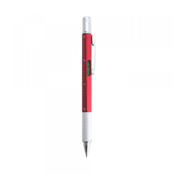 Multi-tool ball pen 4-in-1 with twist mechanism, in varied colors and with soft grip. With built-in level in body, ruler with metric system in centimeters/inches and double-head screwdriver -flat and star-shaped. With metallic clip and blue ink.
