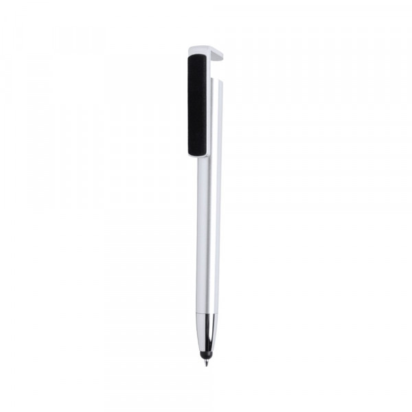 Multifunction ball pen with push-up mechanism in bold colors and dual-function clip especially designed to function as a holder for mobile devices and also as a screen cleaner. With body in metallic finish, especially designed for pad printing and black ink.