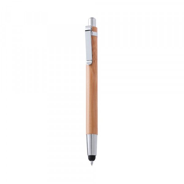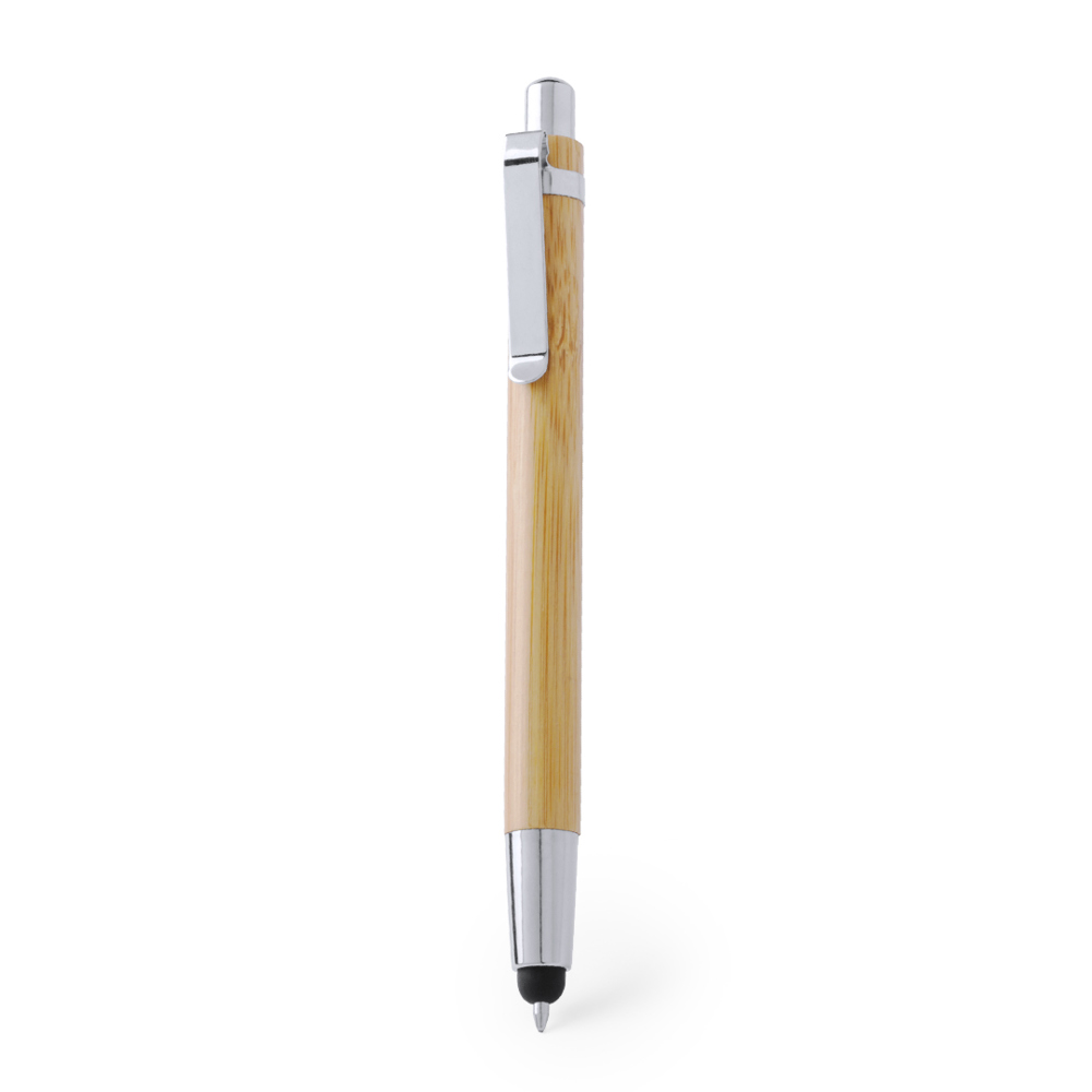 Original bolígrafo puntero de capucha. De diseño minimalista con cuerpo acabado en color blanco brillante y base limpiadora de pantallas. Tinta azul.