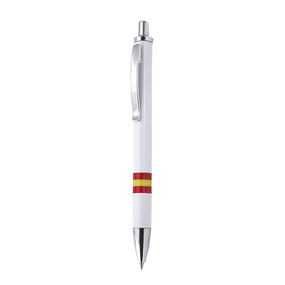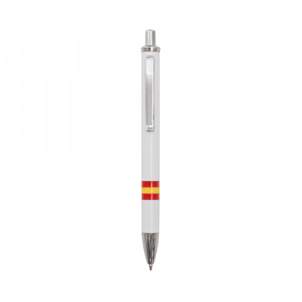 Push-uper ball pen in a stylish bicolor design with glossy silver details and a smooth body in glossy white with the national Spanish flag. With metal clip, jumbo cartridge and blue ink.