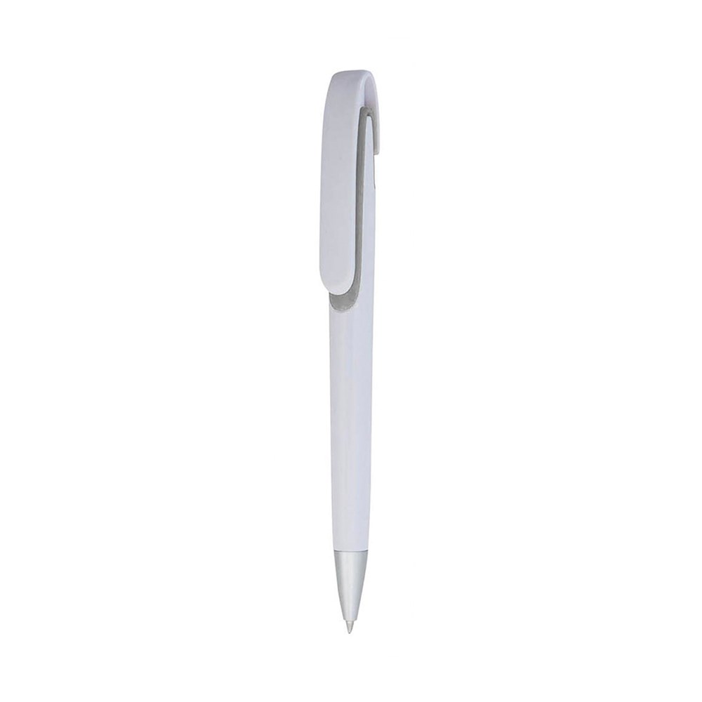 Push-up ball pen with bold tricolor design with brightly colored details and smooth body in solid white. With original matching color curved clip and comfortable grip. Blue ink.