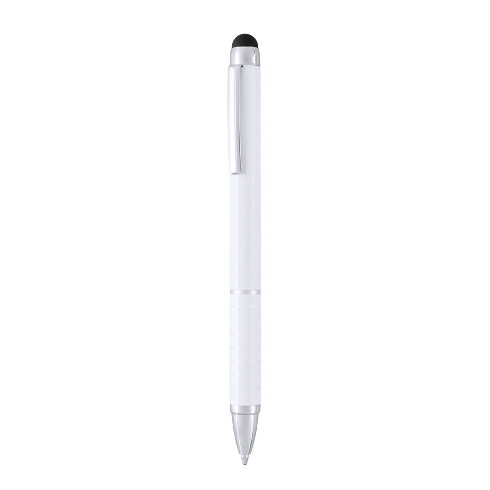 Pointer ball pen with twist mechanism and aluminum body in smooth metallic finish and bright tones. Details and rings in silver color. Original ringed grip and blue ink.