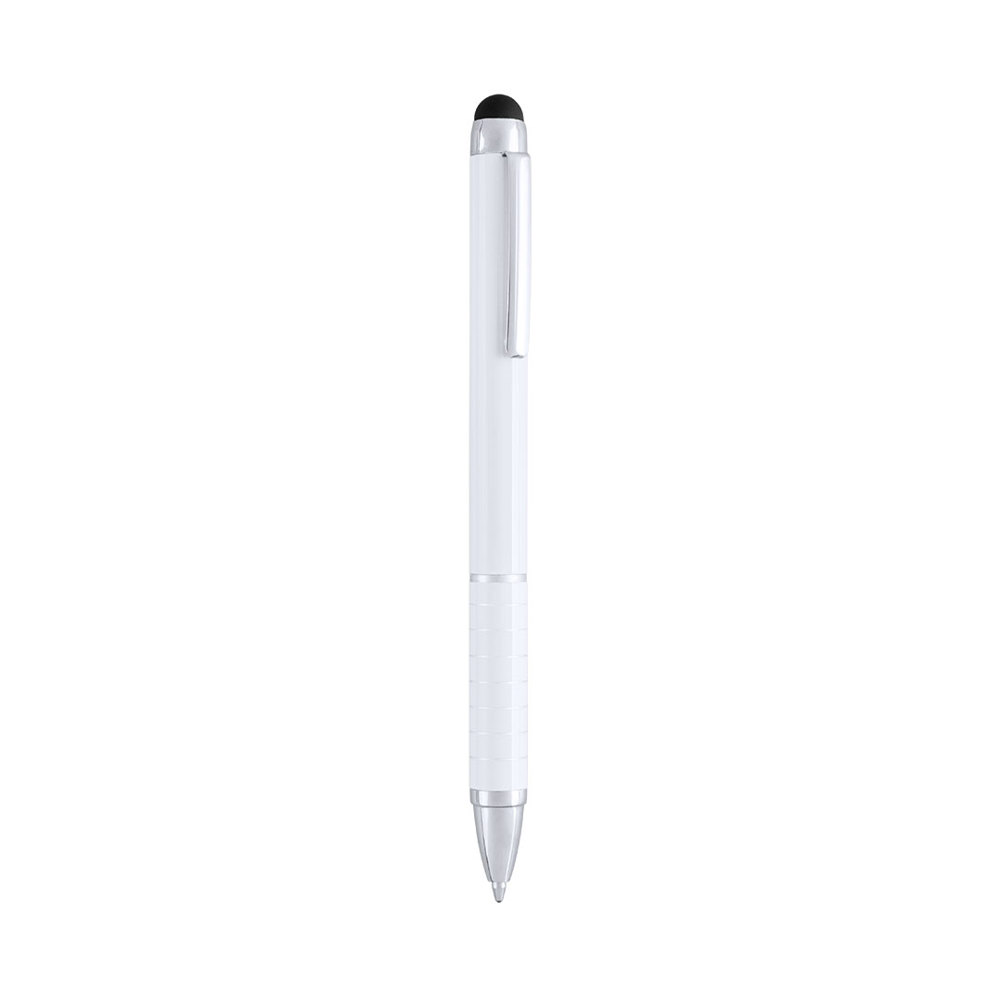Pointer ball pen with twist mechanism and aluminum body in smooth metallic finish and bright tones. Details and rings in silver color. Original ringed grip and blue ink.
