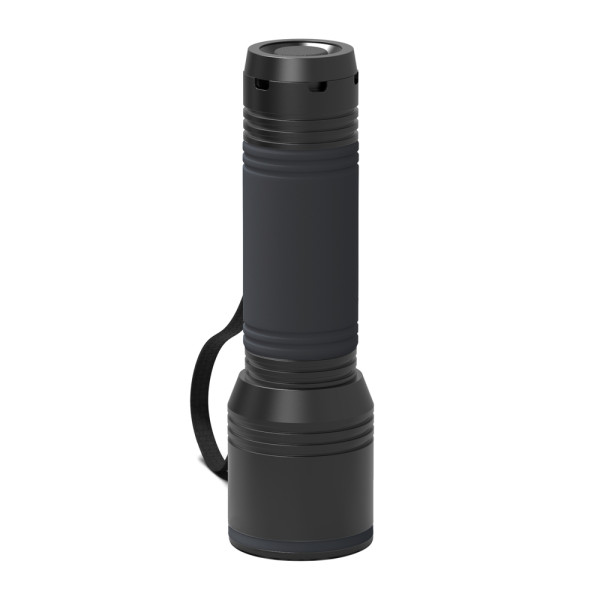 This powerful and rechargeable aluminium torch is an in-house design developed exclusively for the REEVES brand from REFLECTS. The torch is available in silver or black anodised finish, has a black carrying strap and can be combined with a silicone grip sleeve and/or a silicone ring. The silicone components are available in many different colours from Cologne. Of course it is also available without any silicone components.