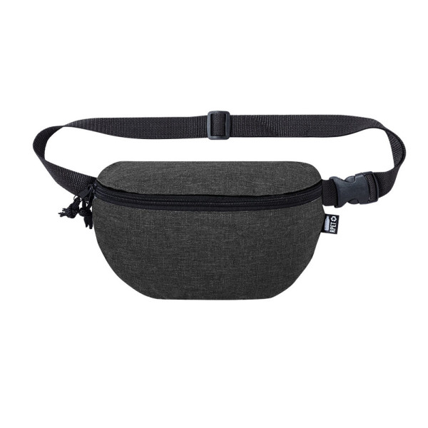 Nature line waist bag made of resistant 600D RPET, melange effect. Made from recycled plastic to encourage the reuse of plastic waste and contribute to the sustainability of the planet. Main compartment with zip and adjustable strap with buckle closure. Designed for sports and leisure activities, with RPET distinctive on the outside label.
