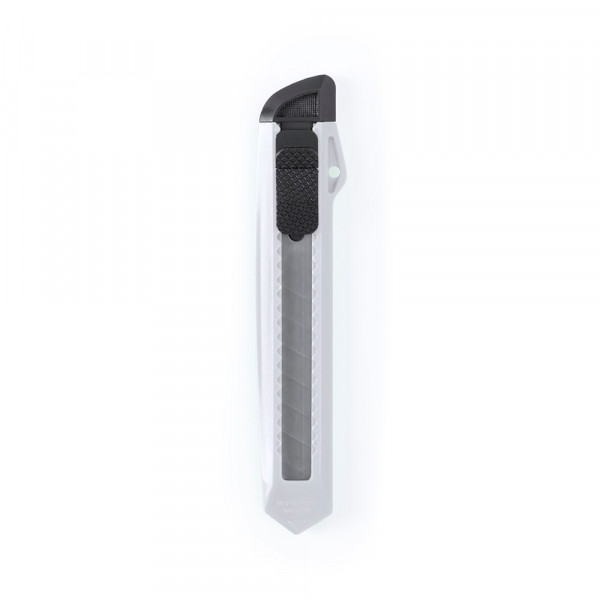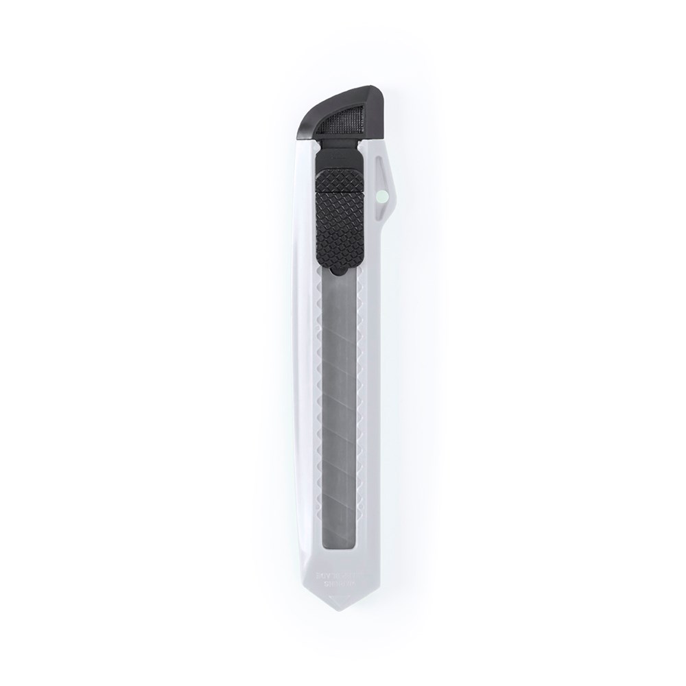 Cutter with wide blade and ergonomic die-cut handle. Removable hood for blade cutting adjustment.