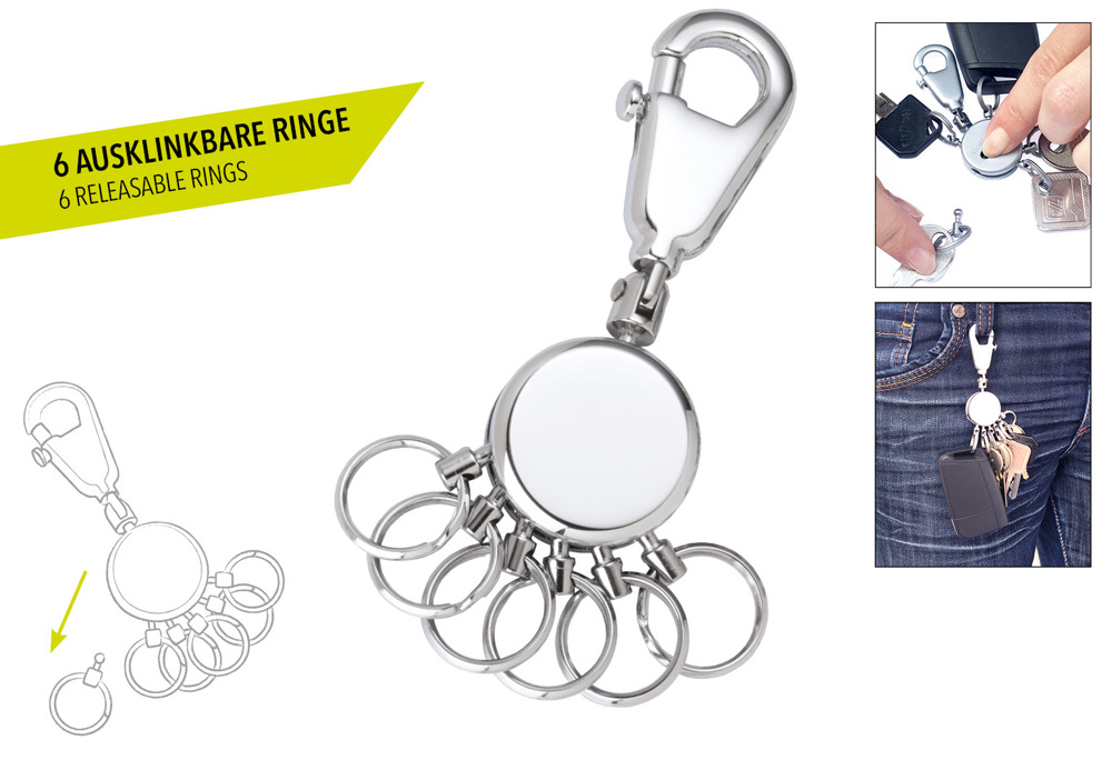 Keyring, round, incl. carabiner, 6 exchangeable rings, Metal/Brass, brass, metal, chrome plated,...