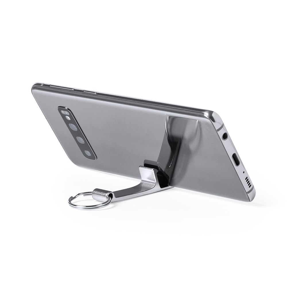 Keyring holder for smartphone and tablet made of aluminum with matte finish, specially designed for laser engraving. Presented in an individual, resealable bag.