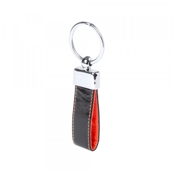 Keychain in elegant bicolor PU leather finish with metallic accessory. Presented in an individual die-cut case.