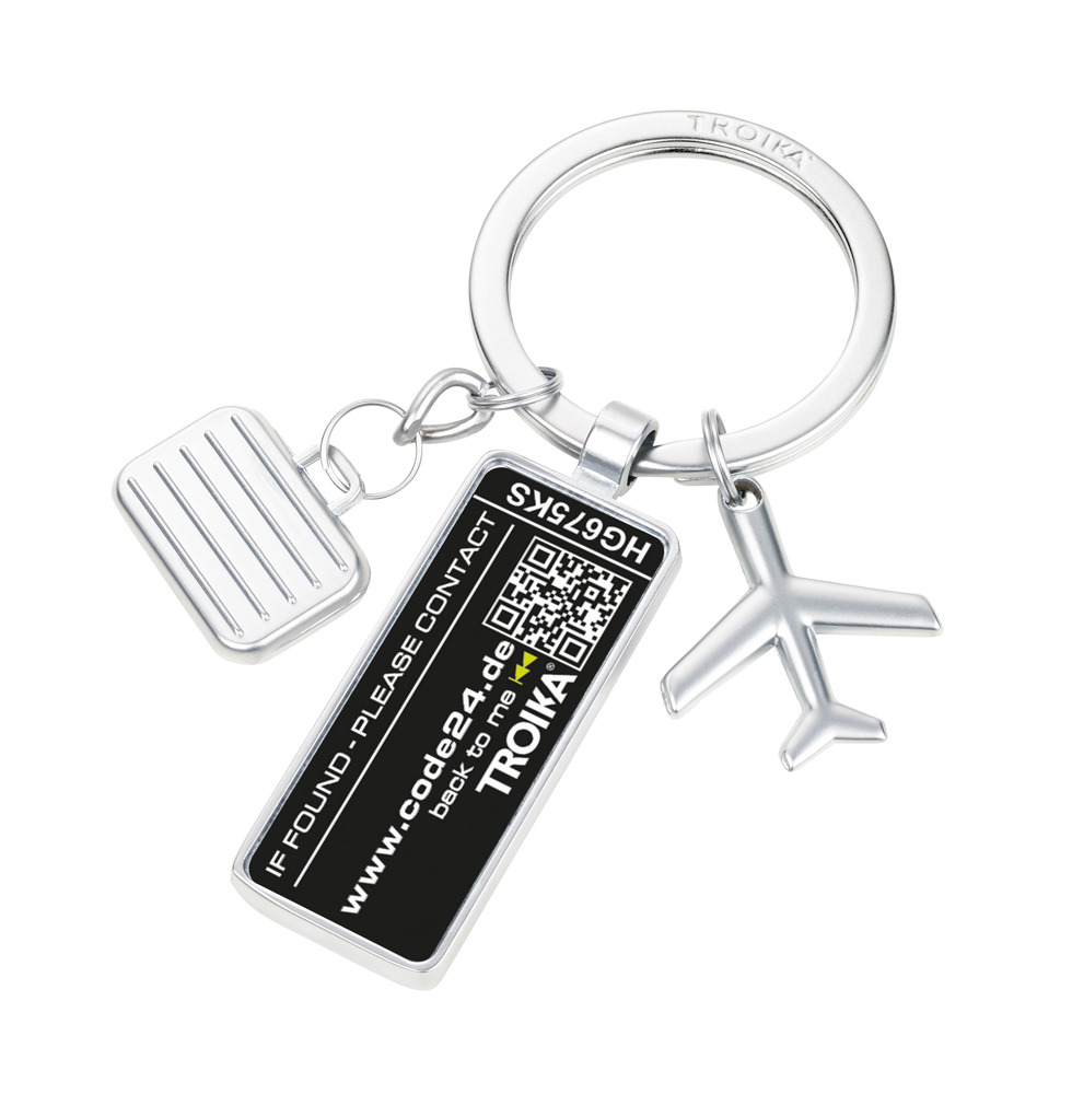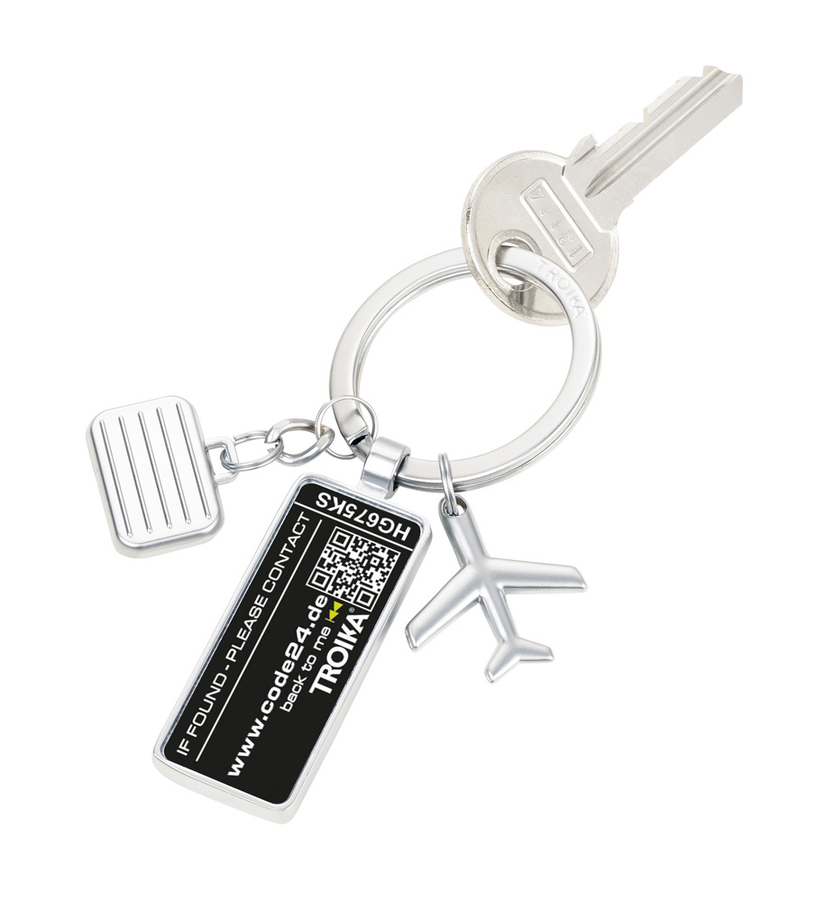 Keyring with Lost and Found Service, 3 charms: airplane, suitcase and plaque, including 2 years...