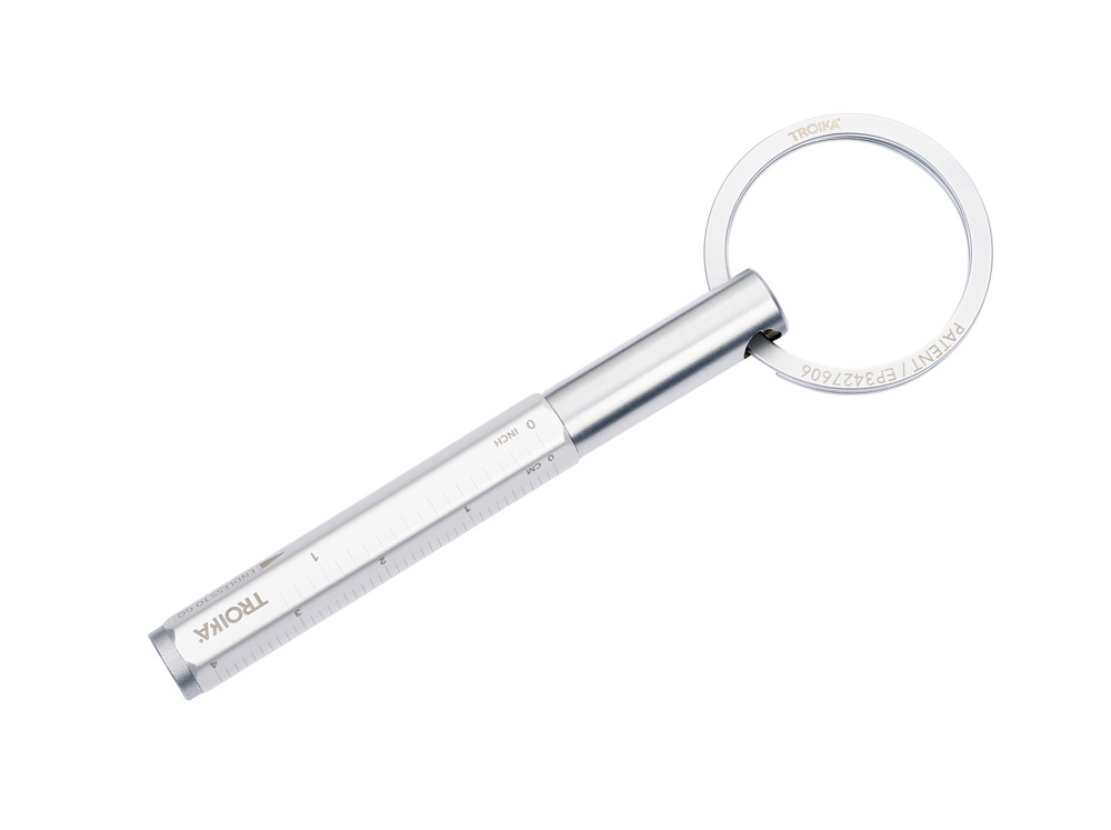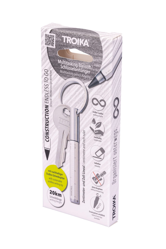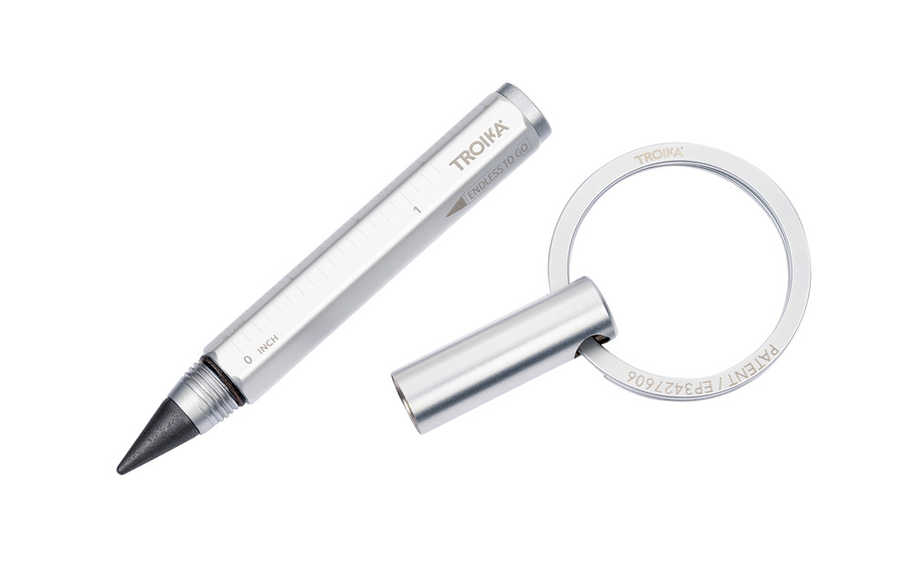 Multitasking pencil and keyring with sustainable endless writing tip (approx. 20 km writing length), quick & easy key attachment thanks to patented opening mechanism (TROIKA NAIL GUARD), centimetre/inch ruler, HB, erasable, no sharpening required, replaceable writing tip, aluminium, matt, silver-coloured