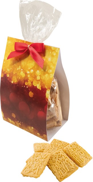 The transparent bag comes with approx. 100 g yummy and top-quality spiced biscuits. Your customers will be pleased about this sweet Christmas giveaway. You may use the standard design of the band for your advertising or, also starting with 100 pieces, for your personalisation Content: approx. 100 g spiced biscuits