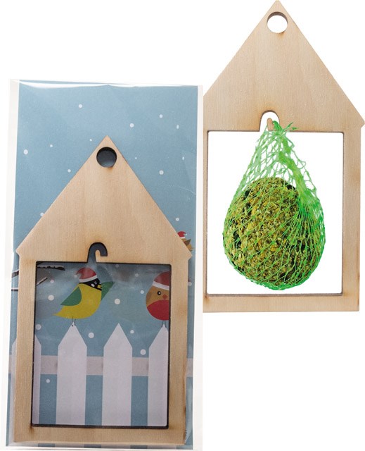 The wooden birdfeeder can be fixed easily and hanged up with a fat ball. It won’t be long and you may watch the birds feeding. Your advertising or personalisation of the card starts with 250 pieces. Content: wooden bird feeder (without bird fat ball)