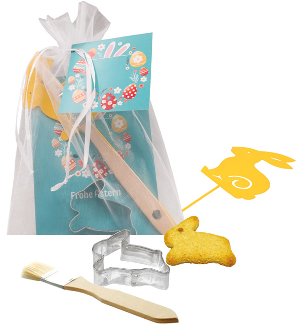 With this charming set of a cookie cutter, pastry brush, metal stick and recipe card, you can bring your customers into the joyful Easter spirit in an instant. The folded card offers the perfect space for your message Your advertising can be printed on the standard design on the card. Your personalisation of the folded card starts as well with 250 pieces. Content: greeting card, pastry brush, yellow metal stick rabbit (approx. 205 x 60 mm), cookie cutter rabbit approx. 5 cm (without cookie)
