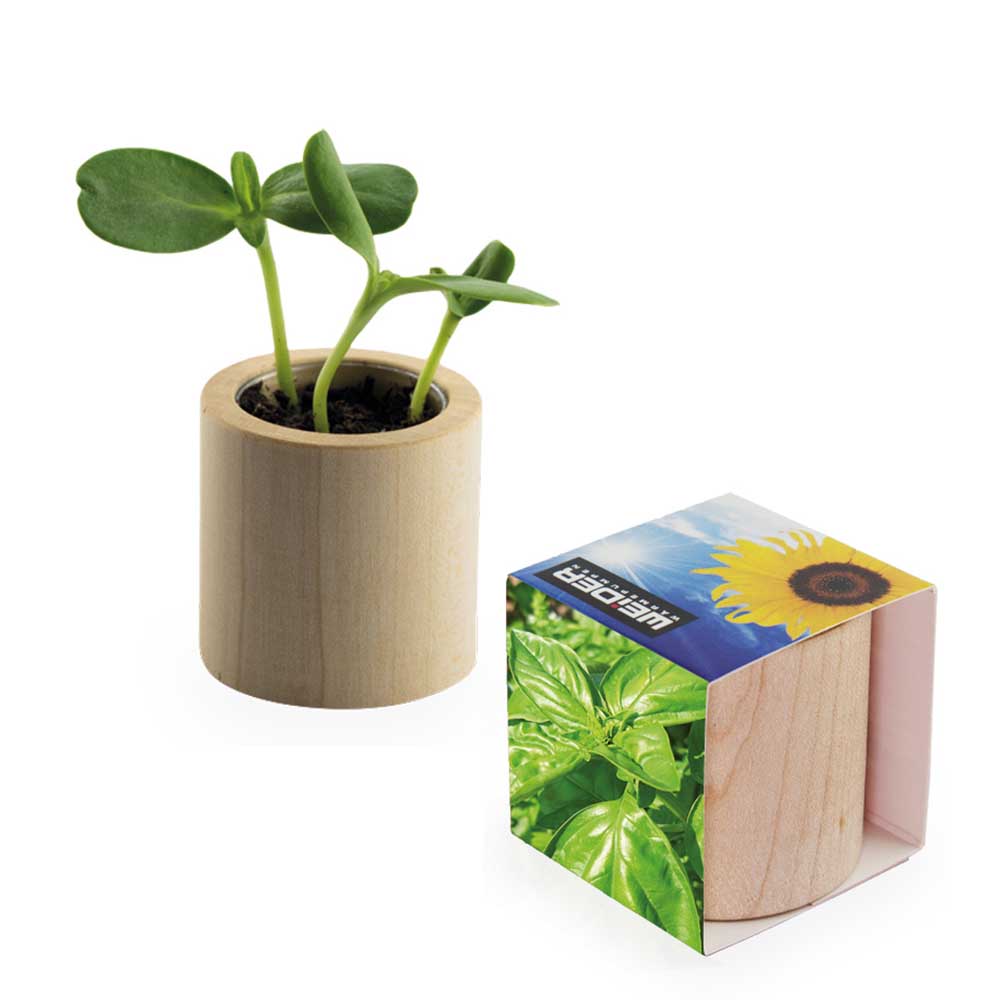 The decorative plant-wood round made of real light, European wood will be delivered with any desired seed and a compost pellet. Your advertisement will find place on the surrounding paper band and a laser engraving is optionally possible on the wood pot. The friendly mini flower pot visualizes the green fingerprint of the company that advertises.