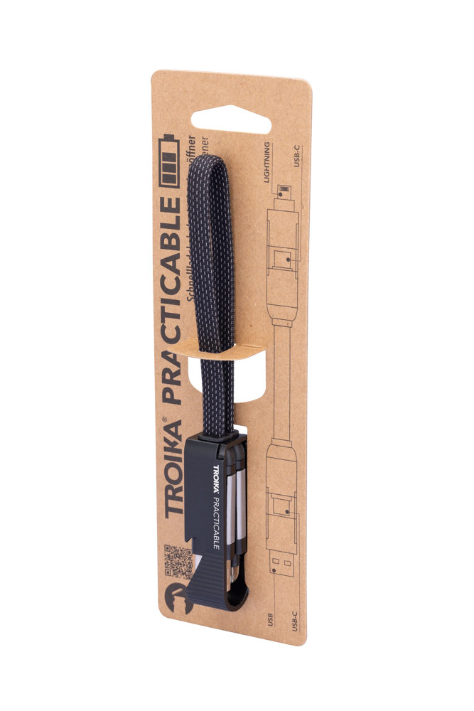 Power Delivery cable with bottle opener for on the go, USB/USB-C to Lightning or USB-C, with data transfer function, textile-braided cable, metal, matt, black