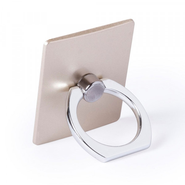Sticky holder for smartphone with minimalist design and elegant silver and golden finish. With telescopic rear finger ring with double function: as a holder and as an accessory for selfies.