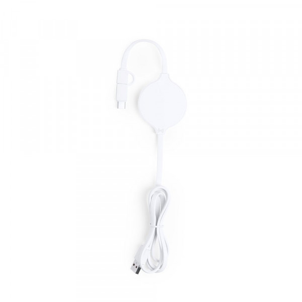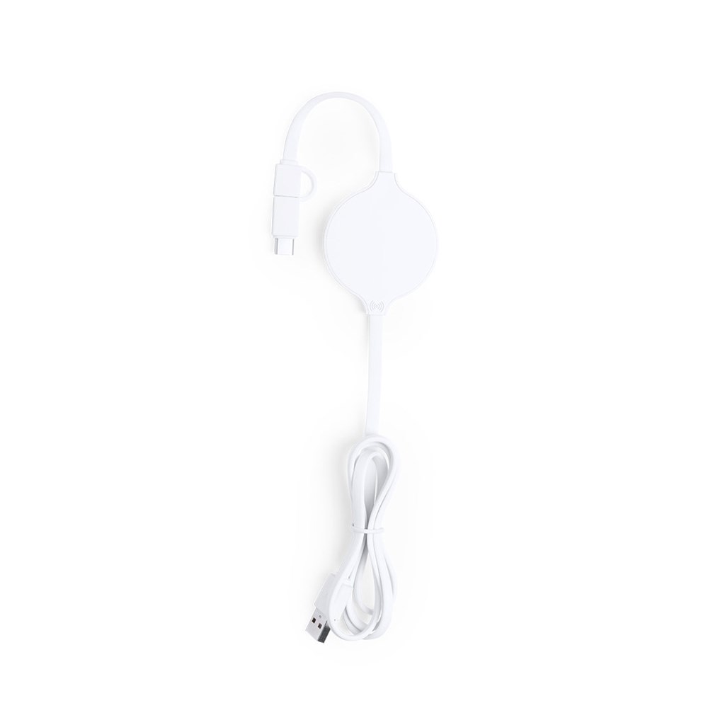 Wireless, ultra compact size charger in monochrome, white color. Connections dual micro USB and Lightning, with Type C adapter, and charging light indicator. Compatible with devices equipped with wireless charging technology.