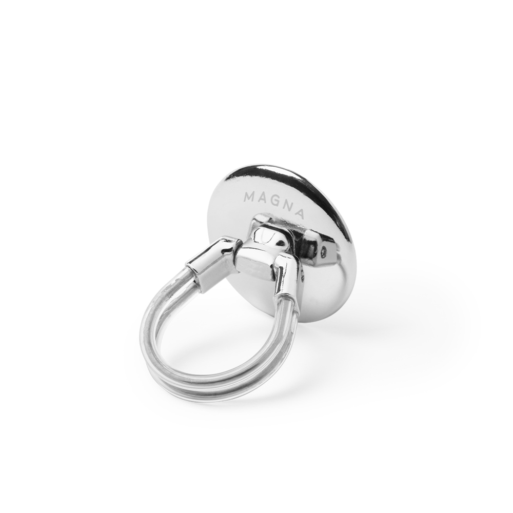 Selfie, smartphone holder in chromed metal. In an elegant design and with 3M adhesive tape, extra strong fixation and residue free when detached from the device. Backside, double holder ring for fingers and vehicle dashboard. Presented in an individual, design bag.