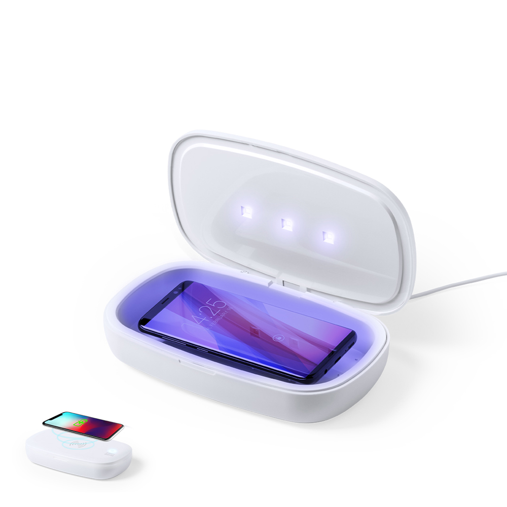 Ultraviolet light sterilizer box type C, with wireless smartphone charger integrated in the lid. Specially designed to eliminate microorganisms and bacteria in everyday objects such as smartphones, keys, glasses, masks, headphones, smartwatch... Made of resistant ABS material with a matte finish and presented in an attractive individual design box. Easy to use, just insert the object inside the box. Bulb power 1W wavelength 270-280 nm, with power supply by 1m long USB cable Type C in matching color. 5 and 10 minutes sterilization time with auto-off function. User manual available in Spanish and English. CE, RoHS and germicidal effectiveness certification available. For proper use of the product, avoid contact with skin and eyes.