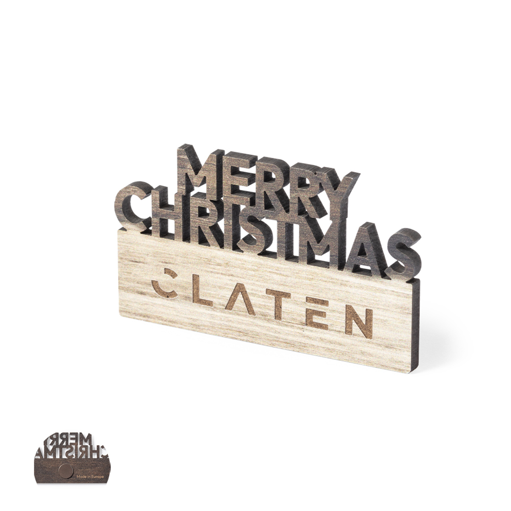 Genuine Merry Christmas magnet made of natural wood, with die-cut text and original bicolor finish. Large branding surface and Made In Europe logo.