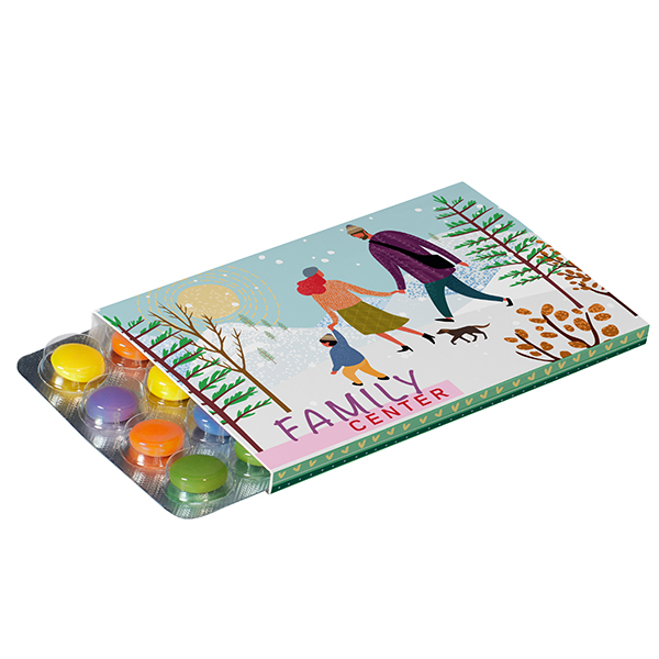 Werbeschuber aus weißer Kartonage, für den Kleinster (Advents-)Kalender der Welt mit Schokolinsen. Hinweis: Inhalt bitte separat bestellen.