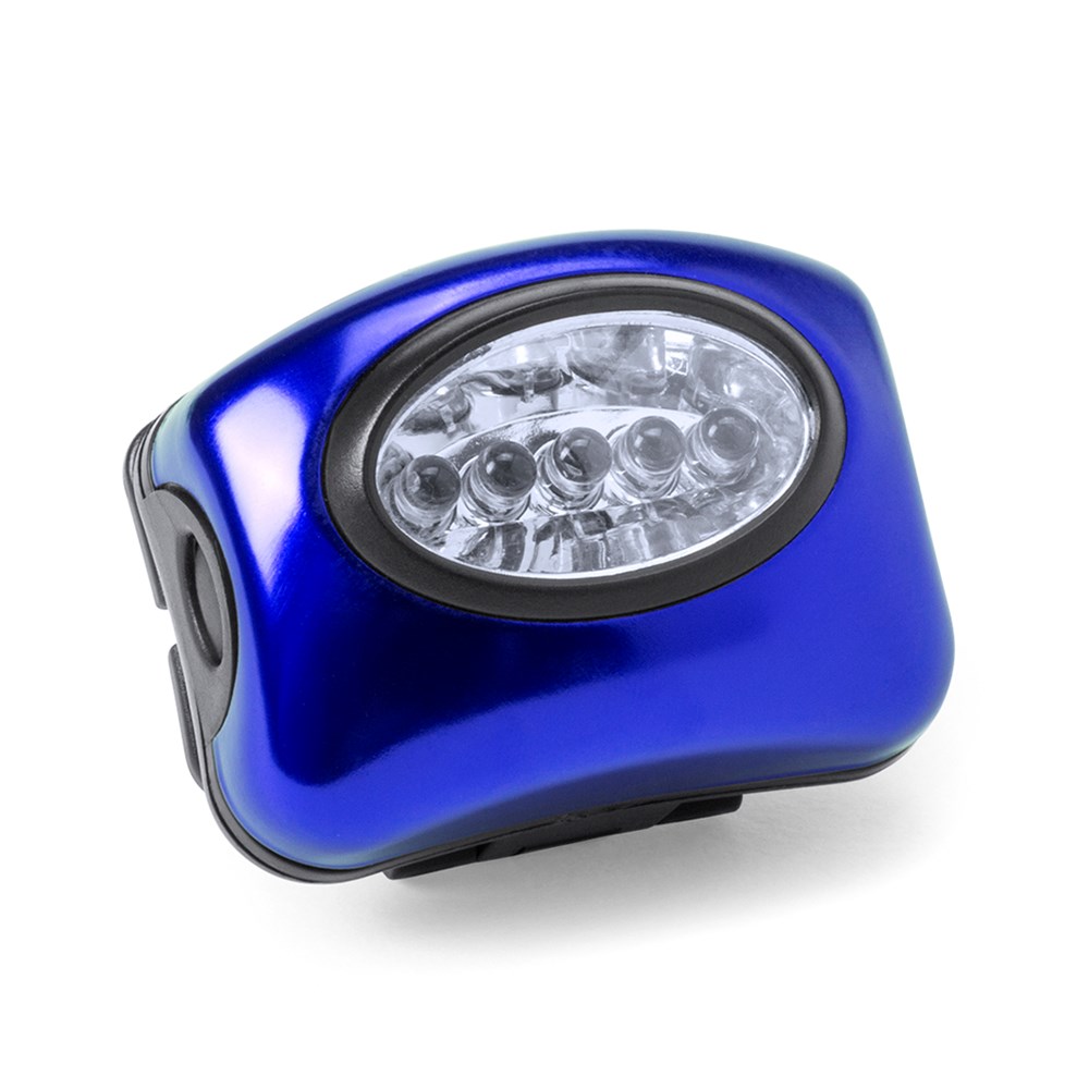 Kopflampe mit 5 LEDs und drei Lichteinstellungen. Mit verstellbarem und angenehm am Kopf sitzendem Gummigurt sowie Gehäuse aus robustem Material in kräftigen Farben. Gurt ist abnehmbar. Batteriebetrieben - 3 x AAA nicht inklusive. Präsentiert in einer individuellen Box in Silber mit Luftpolsterfolie.