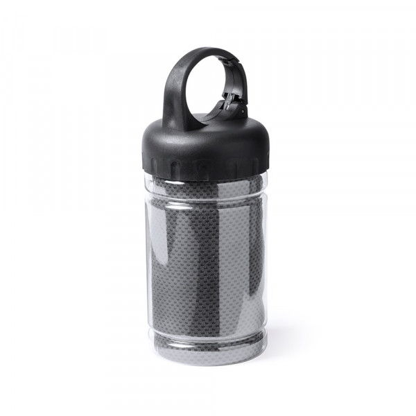 Handtuch mit den Maßen 90 x 30 cm aus kühlendem SoftCool-Extreme-Material (160 g/m2) mit UV-50-Schutz. Präsentiert in einem transparenten Gehäuse mit Deckel und Tragegriff sowie integrierten Befestigungskarabiner.