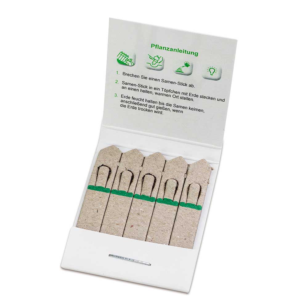 Frühlings- und Sommergrüße oder einfach von Herzen Danke sagen! Anlässe für einen Werbegruß gibt es viele. Mit den Samen-Sticks gelingt einemdabei noch ein Überraschungseffekt: Denn im flachen Briefchen aus Papier erwarten einen keine Streichhölzer, sondern Werbegrüße mit Samen, die sich durch die flache Form und das geringe Gewicht perfekt als Selfmailer eignen. Auf fünf kleine Sticks aus Papier werden wahlweise Basilikum, Fichtensamen, Wildblumen- oder Kräutermischung aufgebracht. Wird ein Stick in die Erde gesteckt und gegossen, sprießt schnell ein kleines Pflänzchen. In Herzform, Standard-Briefchen oder als lustige Biene können sie je nach Werbethema die Botschaft durch die Form unterstützen und individuell angepasst werden. Das Briefchen selbst ist auf vier Seiten individuell gestaltbar. Eine Pflanzanleitung komplettiert das Werbemittel.