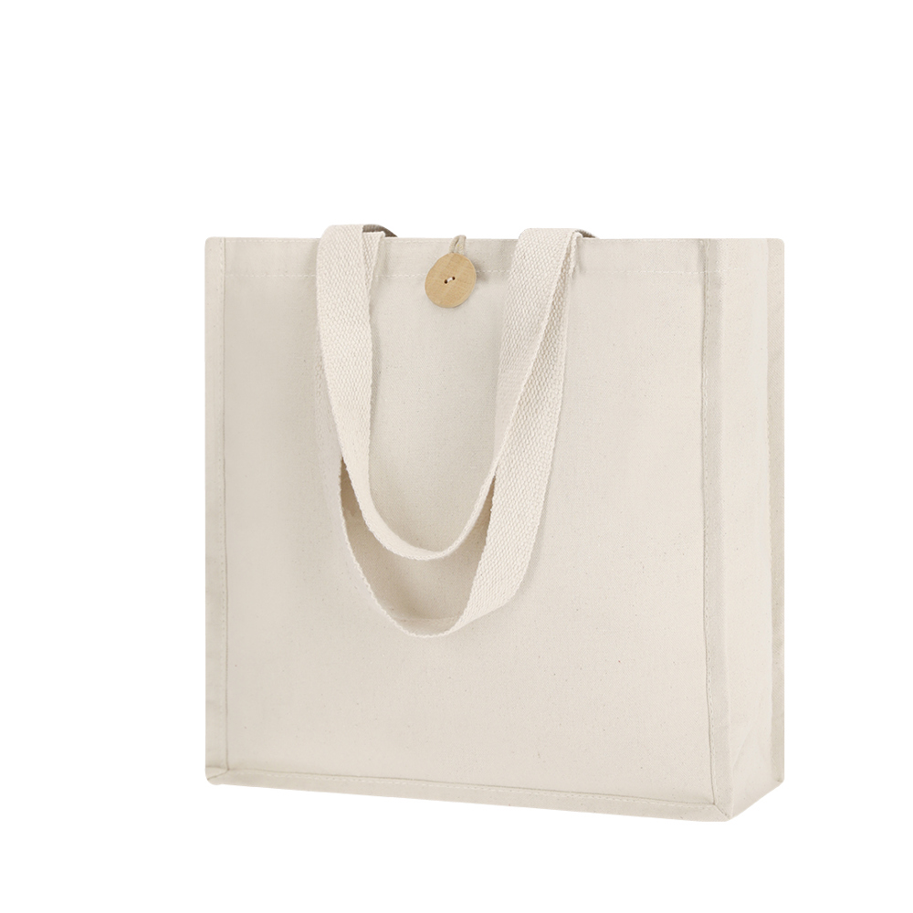 Tasche aus Baumwolle, natürliches Finish und Extragewicht von 310g/m2. Mit Original-Knopfverschluss, genähter Verarbeitung und Zwickel. Extra breite und verstärkte mittlere Griffe (60 x 3,5 cm). Widerstandsfähig bis zu 10 kg Gewicht.