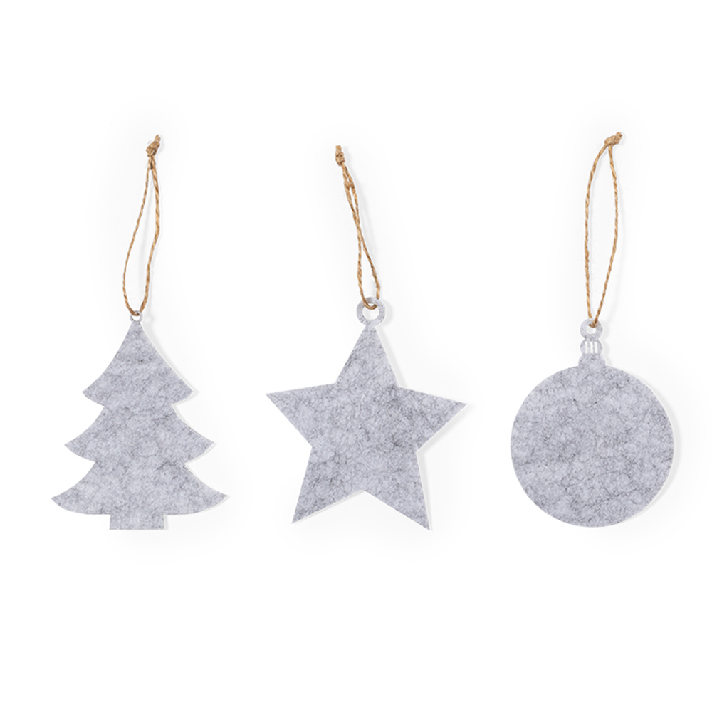 3er-Set Weihnachtsschmuck aus weichem Filz. Enthält 3 Motive: Weihnachtsbaum, Weihnachtsstern und Weihnachtskugel. Alle Teile sind mit Aufhänger versehen. Präsentiert in einer recycelten Papiertüte.
