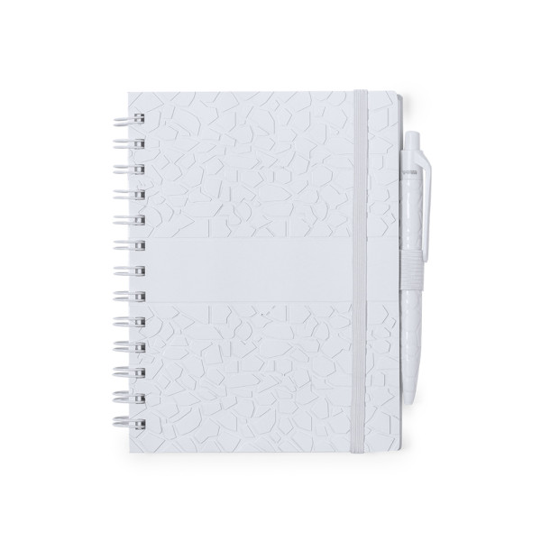 Set aus Notizbuch und Stift. Inhalt: Ringbuch mit hartem Einband aus Steinextrakten in eleganter weißer Ausführung und Stifthalter. Einzigartiger Einband mit geprägtem Design. Mit 70 weißen Blättern und einstreifigem Layout, mit Naturstein-Logo.Kugelschreiber mit Naturlinie und Druckknopfmechanik. Gestanzter Schaft aus Natursteinextrakten, der dazu beiträgt, den Einsatz von Kunststoffen zu reduzieren, und eine glatte, widerstandsfähige Oberfläche bietet. In Weiß mit Naturstein-Logo auf der Oberseite. Jumbo-Patrone und blaue Tinte.Das für die Herstellung des Notizbuchs verwendete Material ist zu 100 % recycelbar und chlorfrei, wasserfest, sehr widerstandsfähig und abwaschbar. Es ist somit eine ökologische und nachhaltige Alternative zu herkömmlichem Papier, das nicht von Bäumen stammt.Präsentiert in einer individuellen recycelten Tasche.