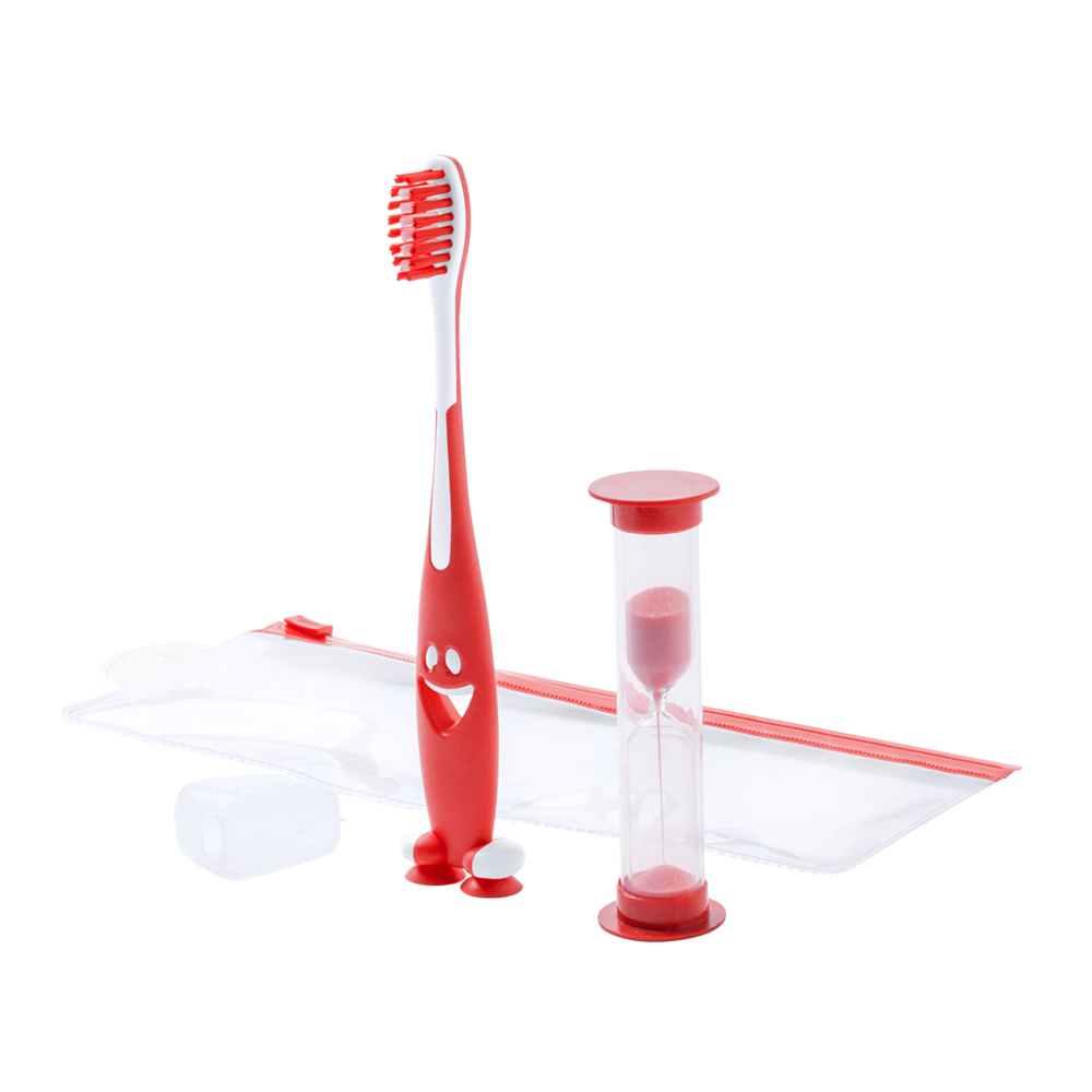 Set aus Zahnbürste und Sanduhr in kräftigen Farben. Enthält Zahnbürste mit lebhaftem Design, weichem Griff und Saugnapf an der Basis sowie eine 2-Minuten-Sanduhr. Präsentiert in einer individuellen Tasche mit Ziplock-Verschluss.