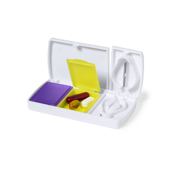 Pillendose aus glattem, robustem Material in Weiß. Mit 2 Innenfächern, Sicherheitsverschluss und Klinge zum Teilen der Pillen.