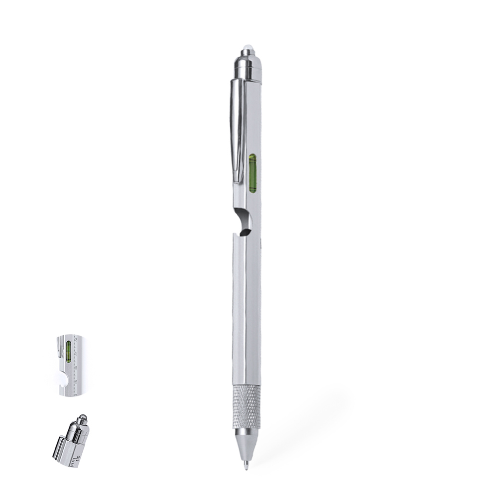 Multifunktionaler 8-in-1-Kugelschreiber mit Drehmechanismus, hergestellt aus Edelstahl. Inklusive Lineal in cm und Zoll, Wasserwaage, Öffner, 1 LED mit Knopfzellenbatterie (im Lieferumfang enthalten), Zeiger sowie Flach- und Philips-Bits. Mit Metallclip und blauer Tinte. Einzeln präsentiert in einer Kraft-Design-Box.