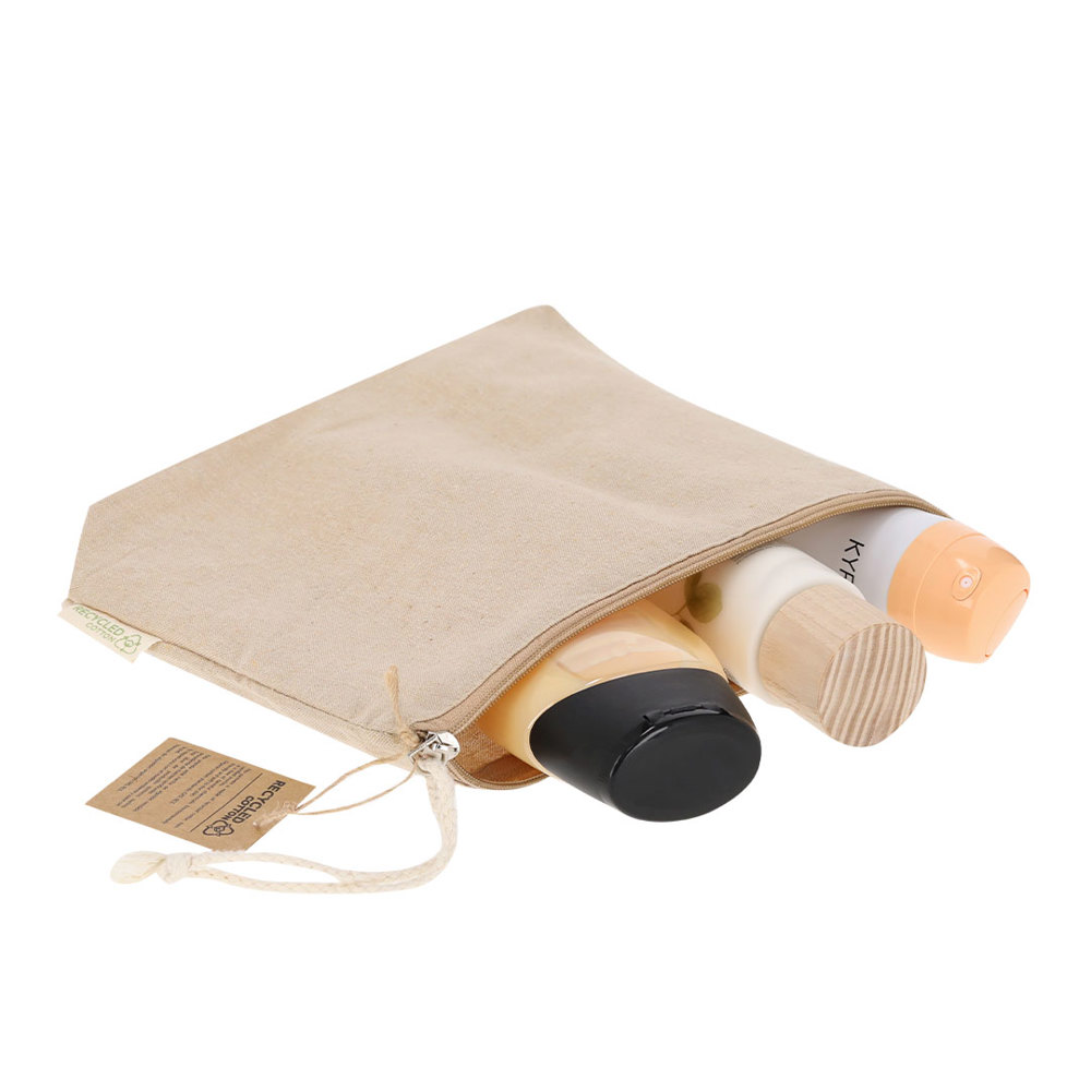 Kulturtasche aus recycelter Baumwolle in elegantem Naturton. Hauptfach mit Reißverschluss und passendem Trageriemen. Inklusive Außenetikett mit Logo für recycelte Baumwolle.