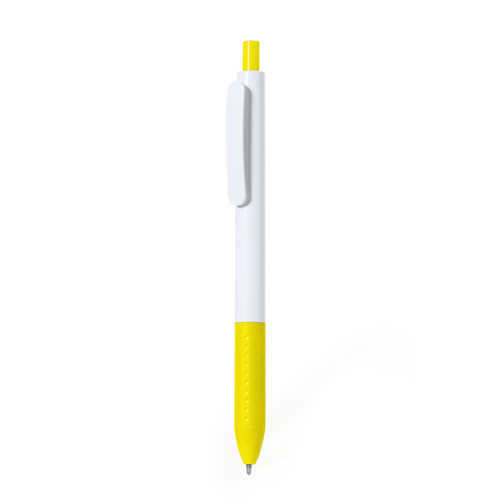 Druckkugelschreiber aus widerstandsfähigem ABS. Hergestellt in einer eleganten Kombination aus Schaft und Clip in Weißtönen. Druckknopf und Griff sind in verschiedenen leuchtenden Farben erhältlich. In blauer Tinte.