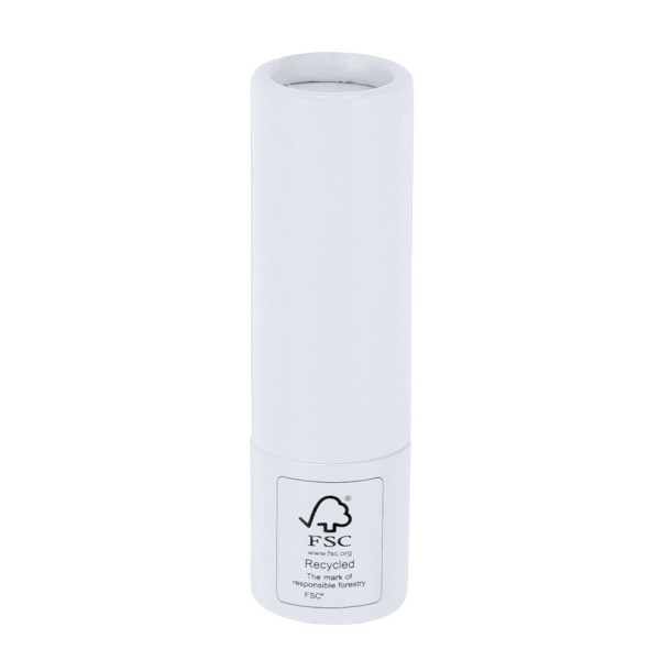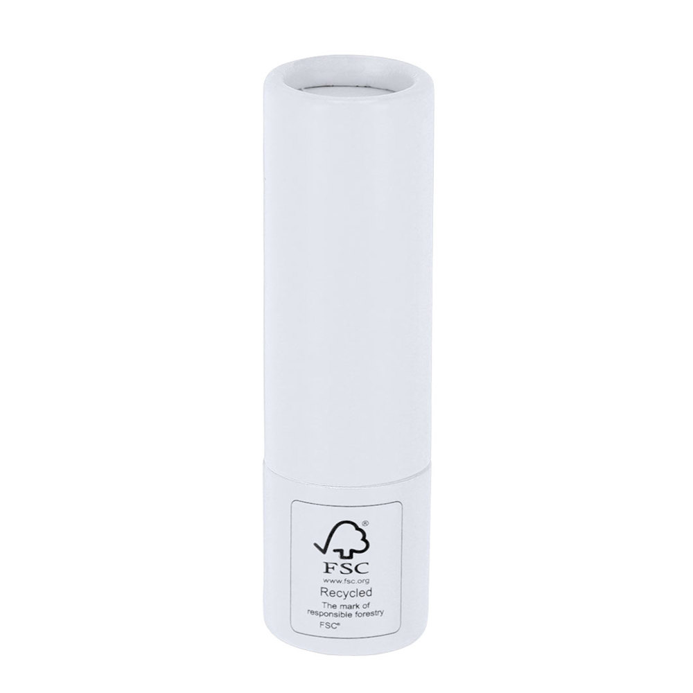 Lippenbalsam aus FSC-zertifiziertem recyceltem Karton. Vanilleduft. SPF15-Schutz. Dermatologisch getestet. FSC®-Label auf der Verpackung.