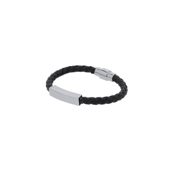 Schwarzes Kunstlederarmband mit einer Plakette aus poliertem Edelstahl in flachem Design. Verfügt über einen originellen magnetischen Sicherheitsverschluss.