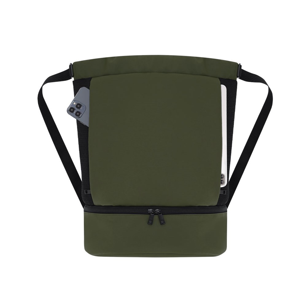 Rucksack aus weichem PU mit Hauptfach mit Kordelverschluss und einer kleinen Innentasche mit Reißverschluss. Enthält eine Tasche im Boden für die Schuhe mit doppelt Reißverschluss und vorderen Taschen mit leicht zugänglichem Reißverschluss. Mit atmungsaktiven Seitenteilen und verstellbaren Schulterriemen.