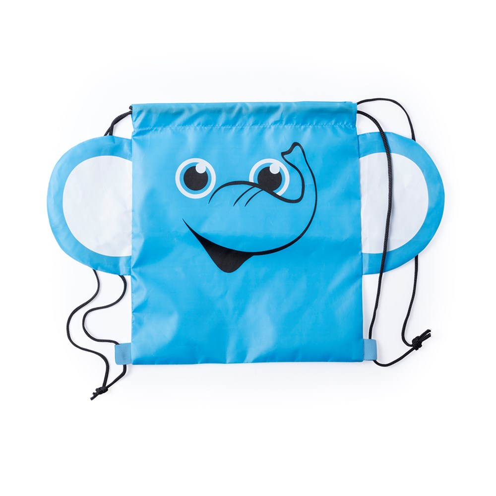 Faltbarer Rucksack mit Kordelzug für Kinder. Hergestellt aus weichem 210T Polyester mit originellen Tier-Designs. Mit Zugbändern in Schwarz und verstärkten Ecken. Faltbar auf kleine Größe.
