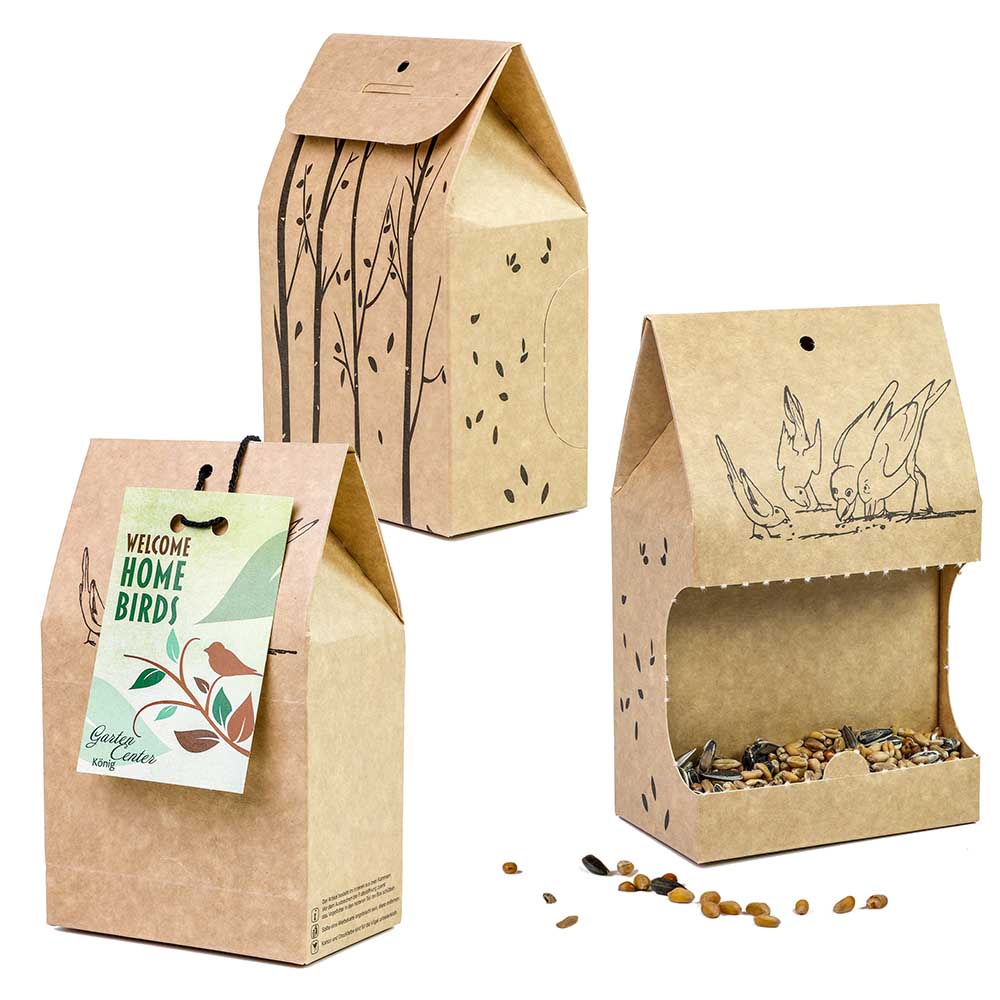 Ein wahrer Gaumenschmaus für heimische Wildvögel bietet das Vogelfutter to-go Häuschen. Das kleine Häuschen besteht komplett aus Karton. Der Zugang erfolgt durch die abnehmbare Futterklappe auf der Vorderseite. Dieses Futterparadieskann sofort aufgestellt oder an einer Schlaufe in einem Baum aufgehängt werden. Das 100 Gramm hochwertige, Ambrosia kontrollierte Streufutter enthält wertvolle Saaten und Getreide. Platz für die frei gestaltbare Werbebotschaft findet sich auf einem Papieraufkleber auf der Futterklappe oder auf einer Werbekarte am Dach des Häuschens. Es ist sichergestellt, dass der Karton und auch die Druckfarbe unbedenklich für Vögel sind.