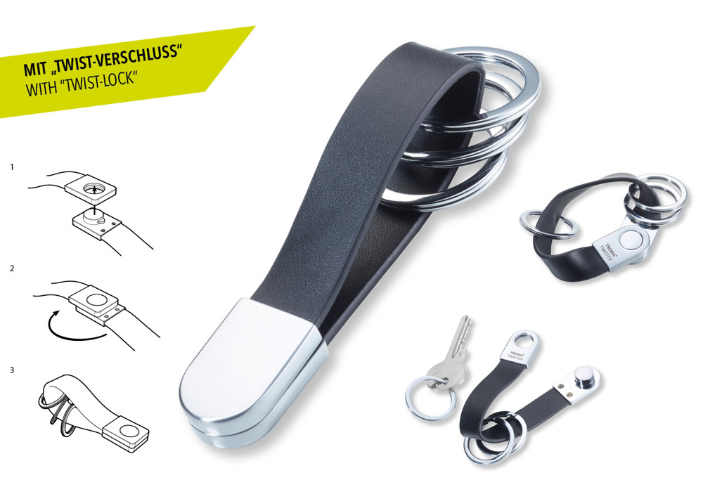 Schlüsselanhänger mit abgerundetem "Twist-Verschluss", Lederschlaufe, 3 Schlüsselringe, Leder, Metallguss, verchromt, matt, schwarz