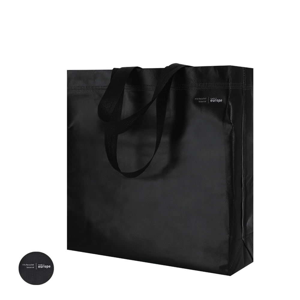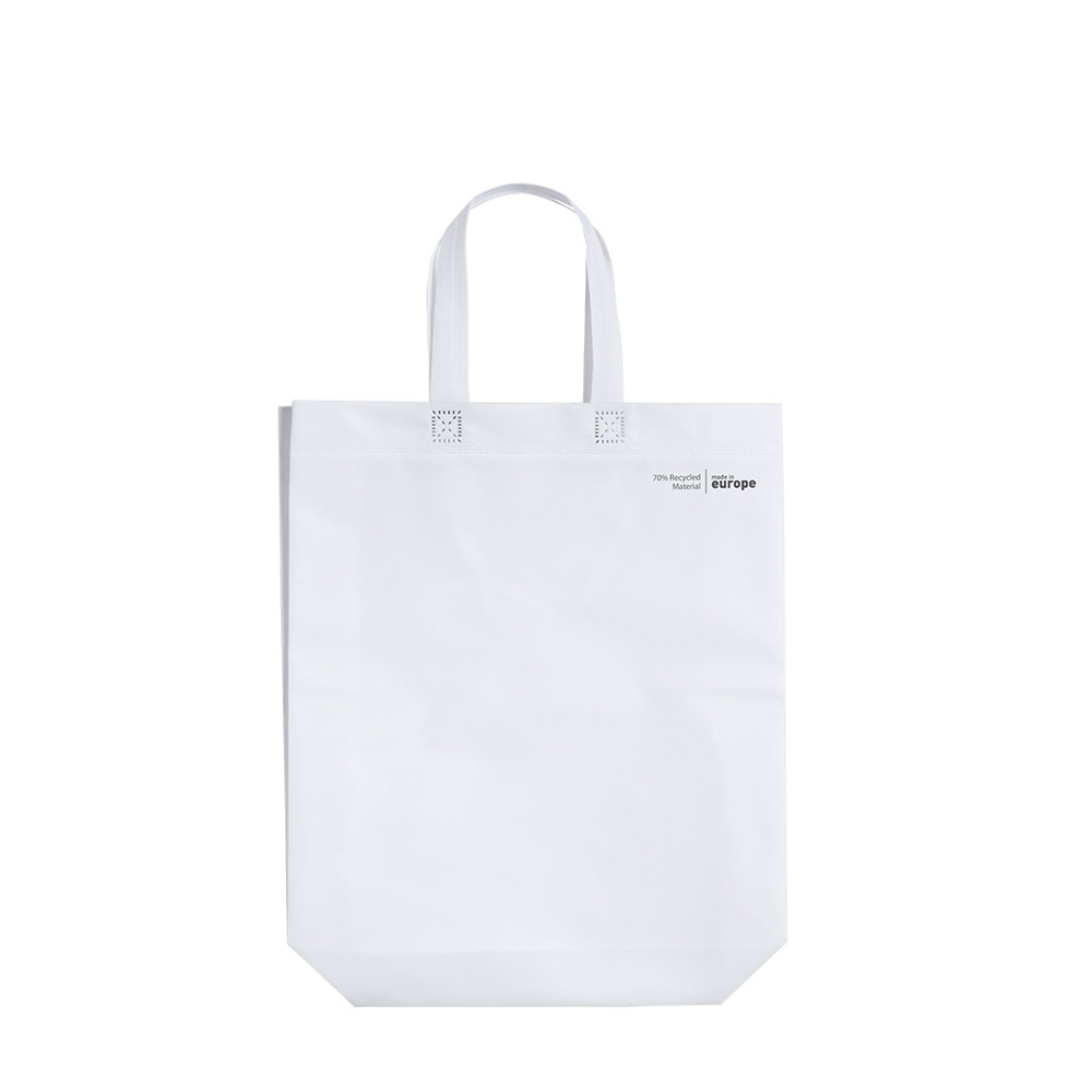 Linie "Natur" Tasche, hergestellt aus 120g/m2 recyceltem Vliesstoff mit Laminierung. Hergestellt in Europa, mit verschweißter Oberfläche, Seitenfalte, langen Griffen und Öko/Made-Emblem auf der Tasche.