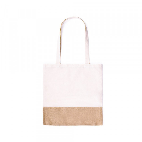 Ökologische Tasche aus einer robusten Kombination von natürlichen Materialien - Baumwolle und Jutefasern (245 g/m2). Mit attraktivem, zweifarbigem Design, Steppnähten und 70 cm langen, verstärkten Henkeln. Belastbar mit bis zu 8 kg.