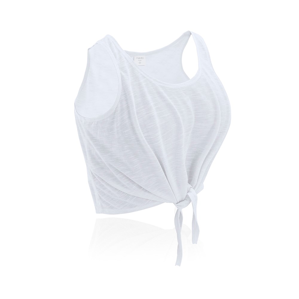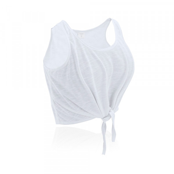 Kurzes Tanktop für Mädchen aus weichem Polyester (130 g/m2) mit Knotendetail an der Vorderseite. Erhältlich in Weiß sowie in verschiedenen kräftigen Neonfarben. In den Größen S, M und L.