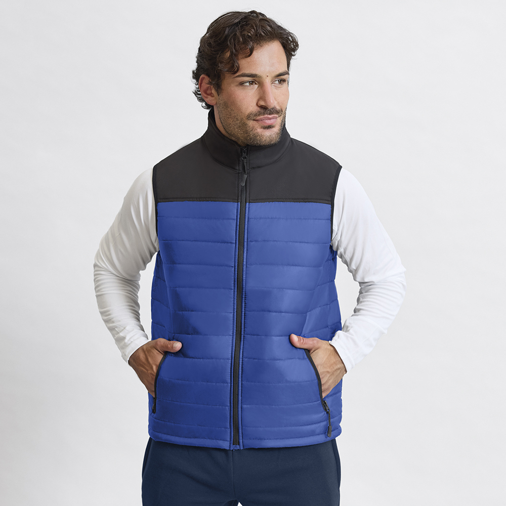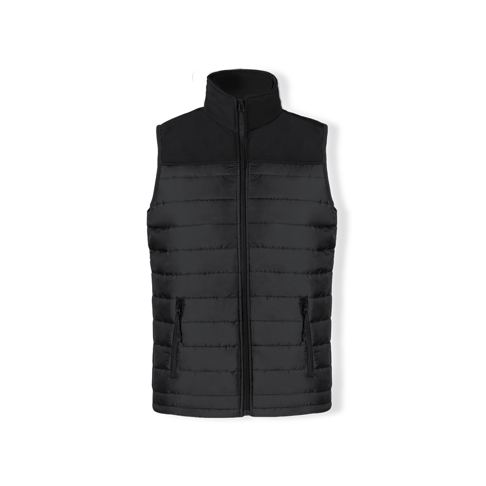 Wasserdichte und atmungsaktive Weste in Kombination aus Softshell- und Polyestermaterialien. In eleganter schwarzer Farbkonstruktion, mit Reißverschluss und seitlichen Reißverschlusstaschen, mit Pullern zum einfachen Öffnen. Erhältlich in den Größen S, M, L, XL, XXL.