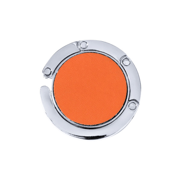 Klappbarer Handtaschenhalter aus Metall mit Kunstledereinsatz in leuchtenden Farben. Präsentiert...